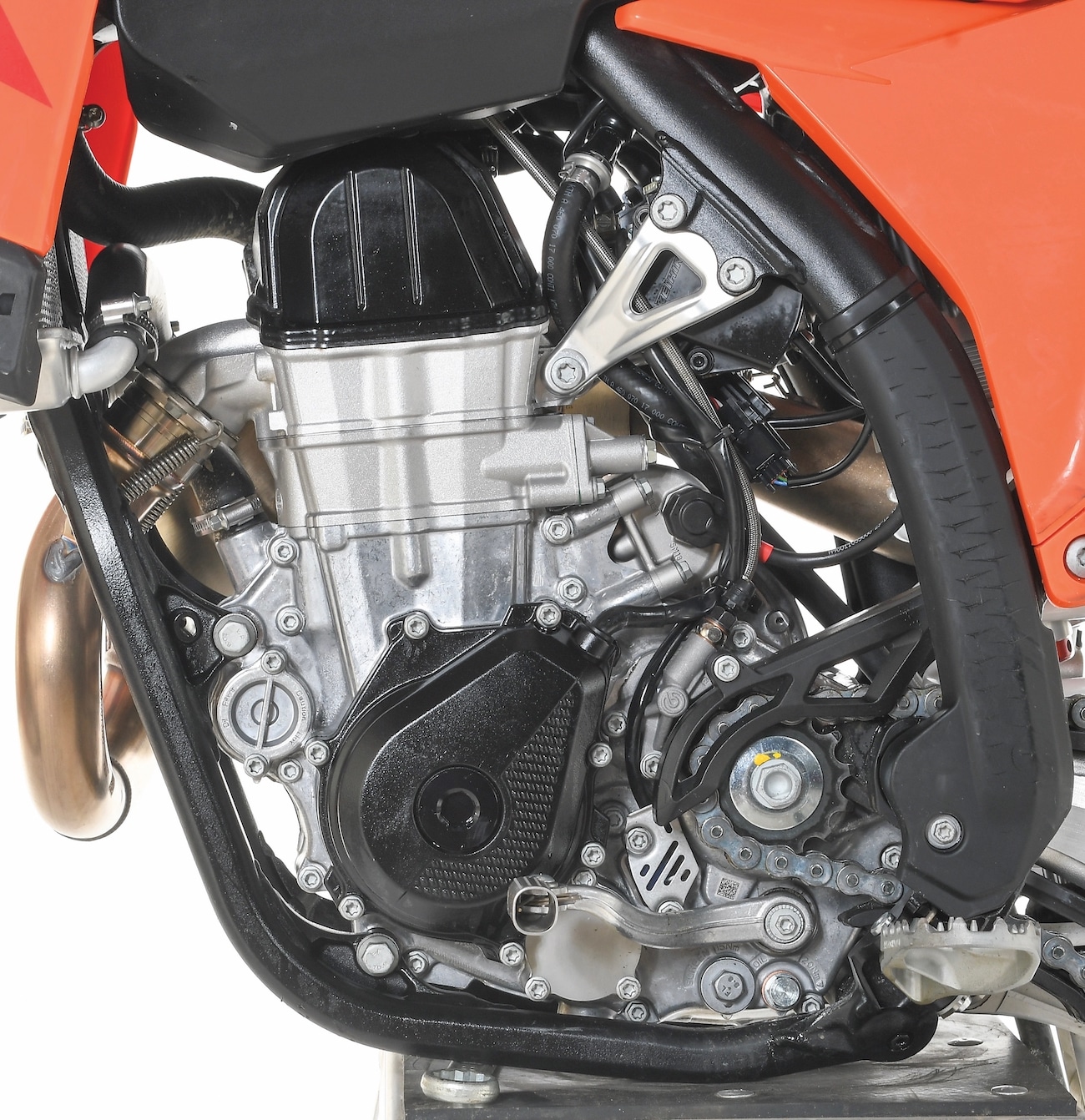 Inside the black clutch cover is KTM’s groundbreaking Belleville washer-activated clutch, which is showing up on more and more Japanese machines.