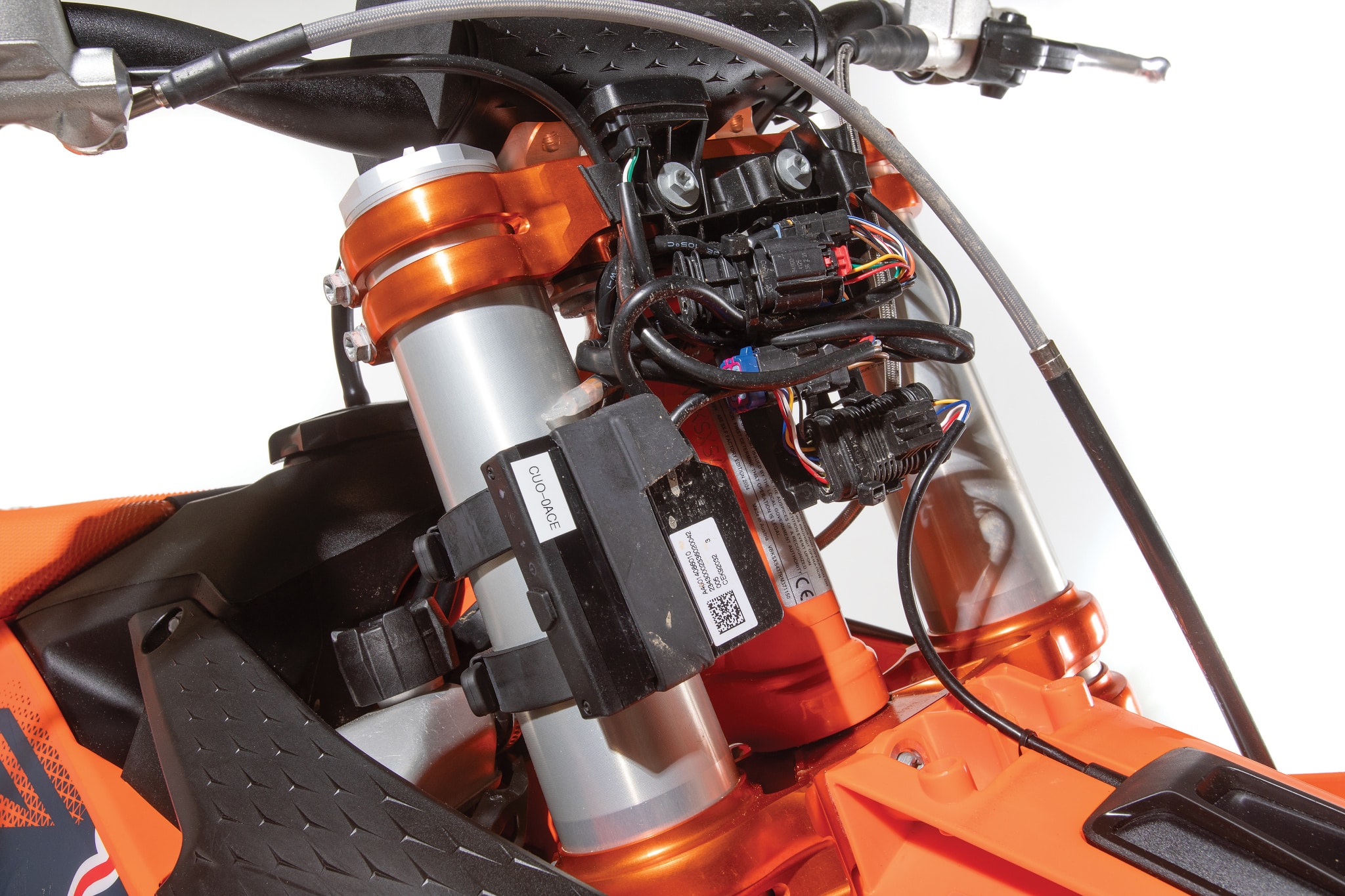 Behind the number plate, strapped to the right fork leg, is the new CUO. This allows you to connect your smartphone to your bike.It came stock on the 2023-1/2 Factory Edition, but you have o buy it for the the 2025 KTM 450SXF.