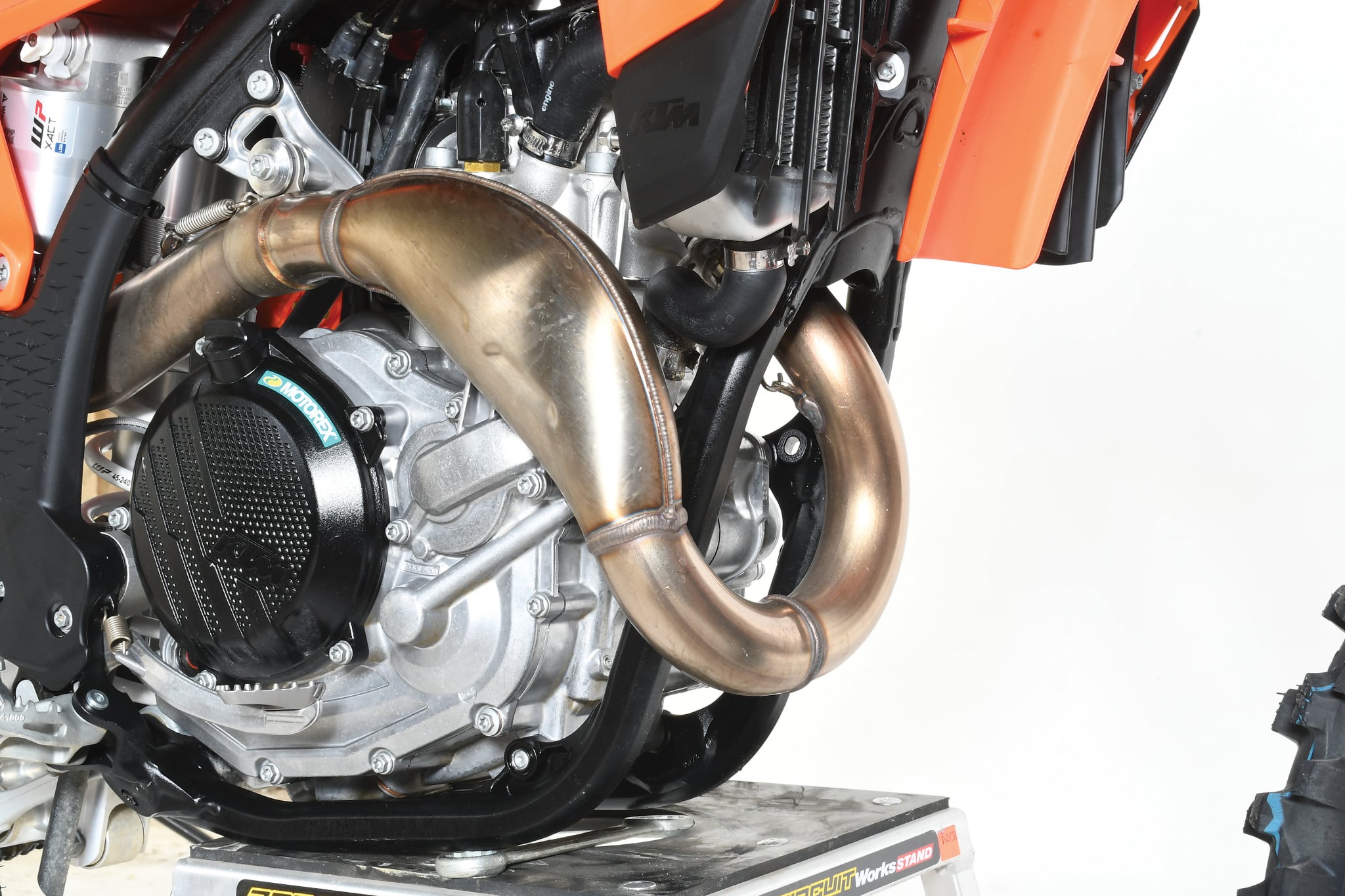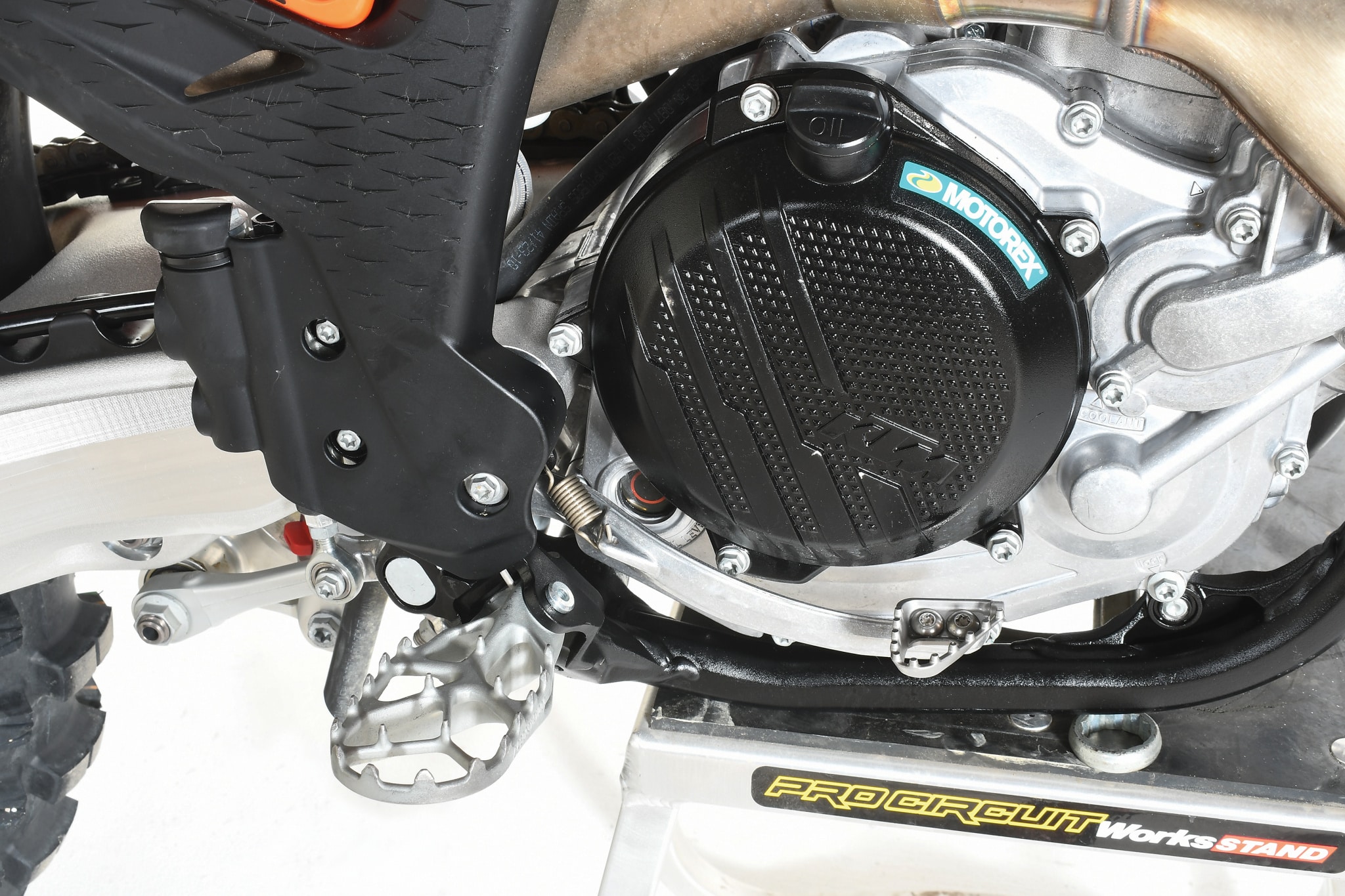 Inside the black clutch cover is KTM’s groundbreaking Belleville washer-activated clutch, which is showing up on more and more Japanese machines.