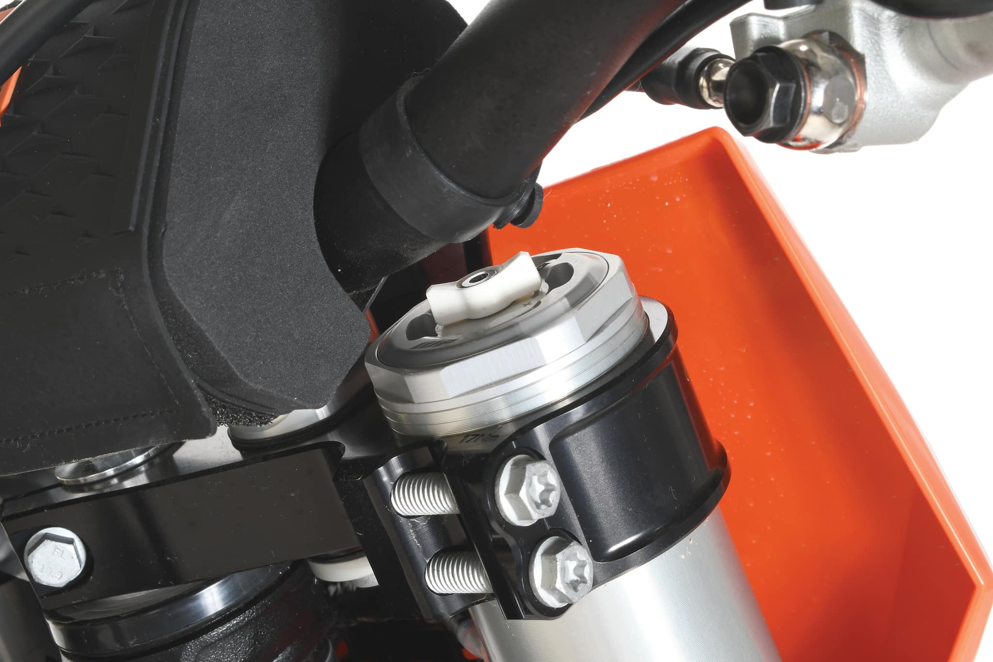 There are also new air seals that lessen air-pressure peaks to resist the dreaded J-curve air-pressure spike at the end of the stroke. In 2023, WP came out with the Hydrostop bottoming control system that uses tapered cone shapes to create an “oil lock” that stops the forks from bottoming. Perhaps the best feature of the WP XACT air forks is the trampoline shim. It’s called a “trampoline shim” because it flexes under oil pressure, much like a trampoline goes up and down under a gymnast’s body weight. The trampoline valve lessens the mid-stroke spike when the shim stack is over-pressurized. If you look closely at the fork cap on the left leg, you will notice a black anodized threaded plug. Do not remove it. It has nothing to do with the forks on the 2025 KTM 450SXF. It is where a data-acquisition sensor will plug into the forks in the future.