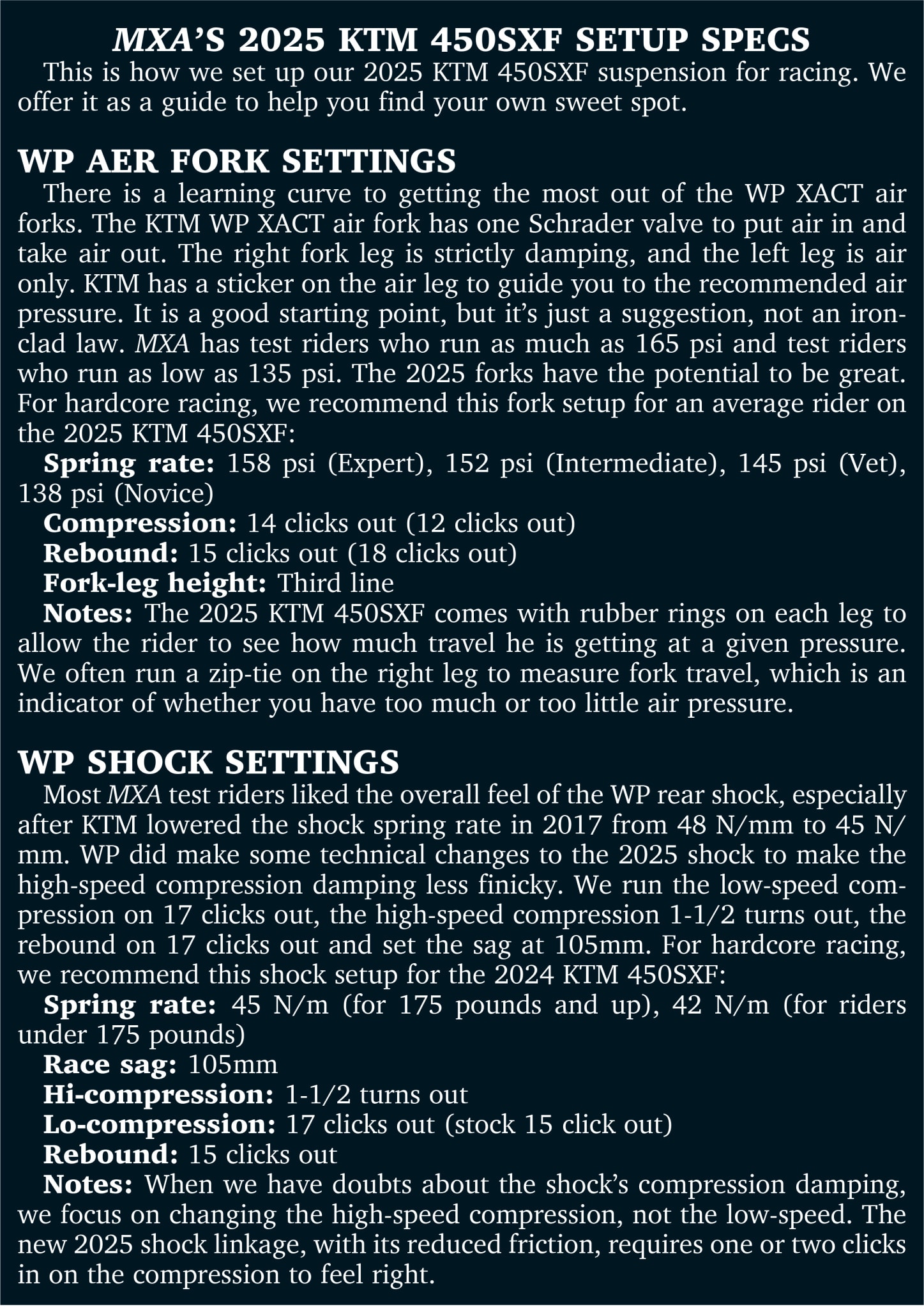 A: We got a lot of test time on the 2025 KTM 450SXF because we had lots of hours on the 2024-1/2 KTM 450SXF Factory Edition, which is a gussied-up 2025 KTM 450SXF.