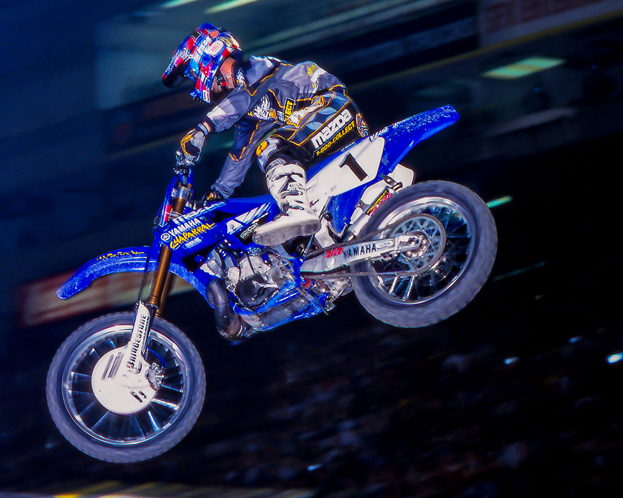 Jeremy McGrath at 2000 Anaheim 1 on his Team Chaparral/Mazda, 1-800-Collect YZ250. This would end up being his seventh and final Supercross title.